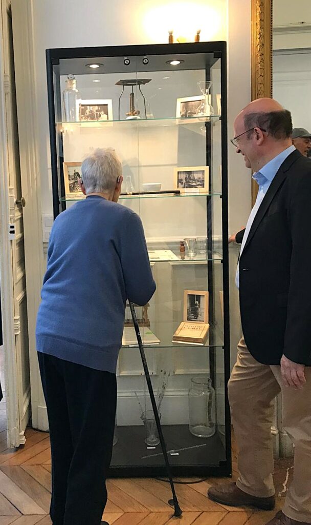 – Hélène Langevin-Joliot et le Pr Yves Jacquot devant une des vitrines de l’exposition